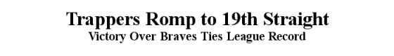 IDAHO FALLS – The Salt Lake Trappers Blasted their way to a record-tying 19th straight victory with a 13-0 rout of the Idaho Falls Braves. Koichi Ikeue went the distance throwing a four-hit shutout, while Ed Citronelli, Jim Ferguson and Mike Malinak combined to drive in nine runs on nine hits. Ferguson ripped a bases loaded double to ignite the Trappers in the fifth, while Citronelli and Malinak crushed a pair of two-run homers in the eighth and ninth innings.