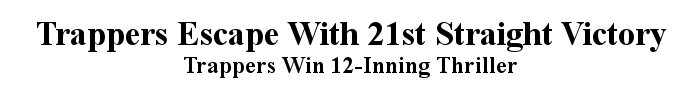 POCATELLO – Miraculously, unbelievably the Trappers kept their unbeaten streak alive. Trailing nearly the entire game, Salt Lake rallied to tie it in the eighth inning, fought off Pocatello game-winning opportunities in the ninth and tenth innings and beat the Giants in the 12th on a solo home run by Mike Malinak and a run scoring single by Steve Scott.