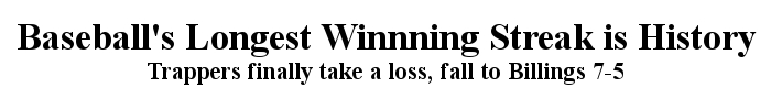 BILLINGS – The longest winning streak in professional baseball history is history at 29 games. The Billings Mustangs – taking a page out of Trappermania with a six run first inning – outlasted SaltLake 7-5.